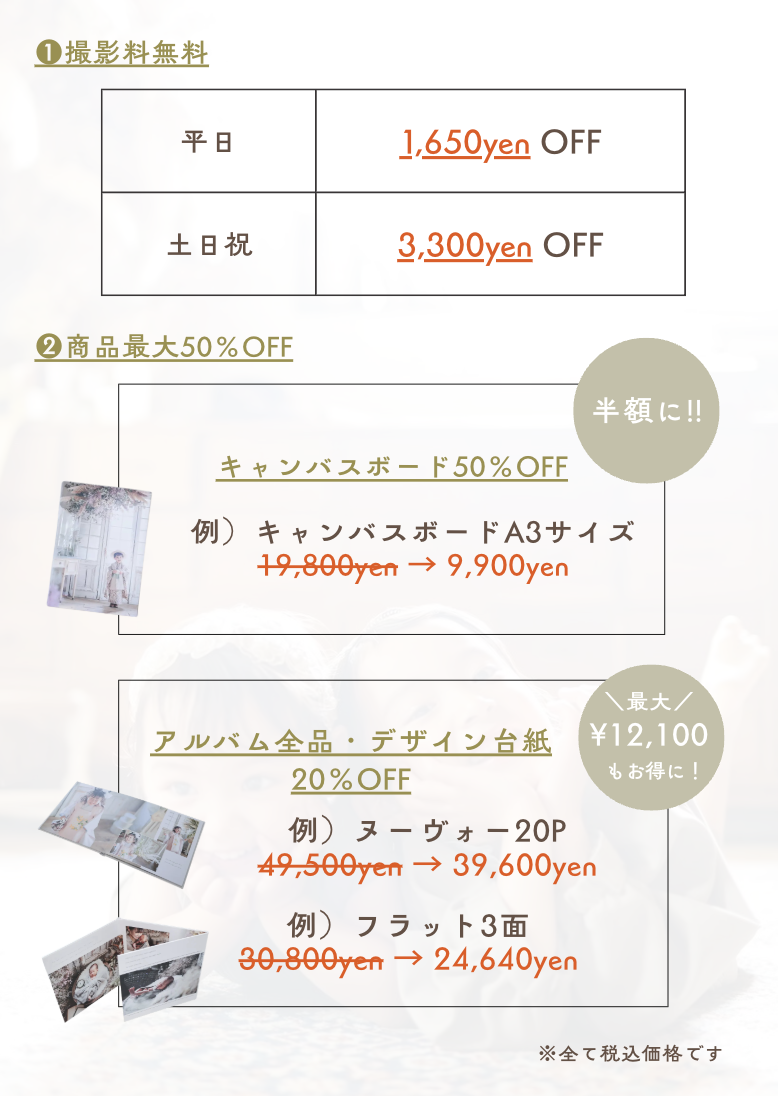 割引内容をご確認の上、お好みの撮影内容(特典)でご予約ください。